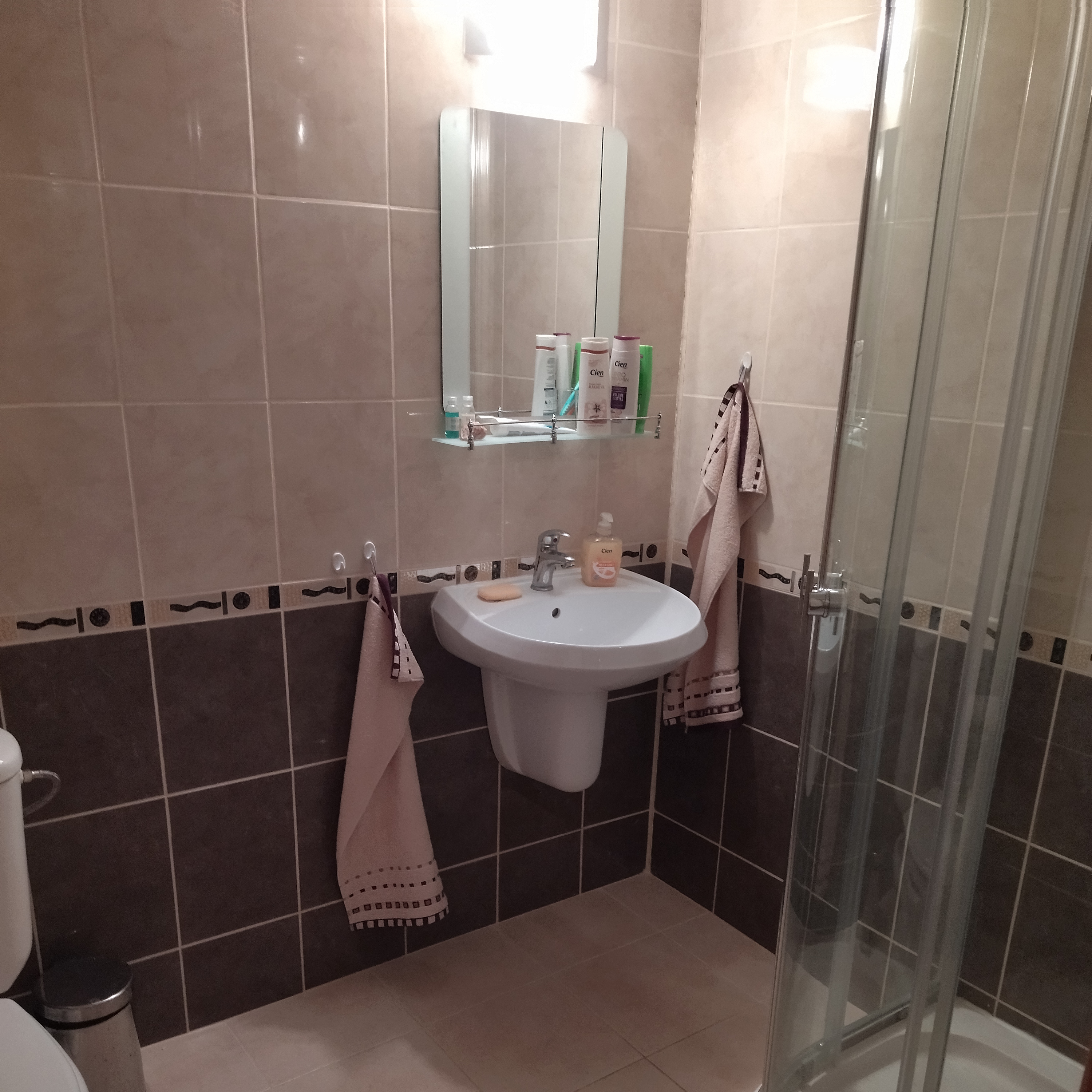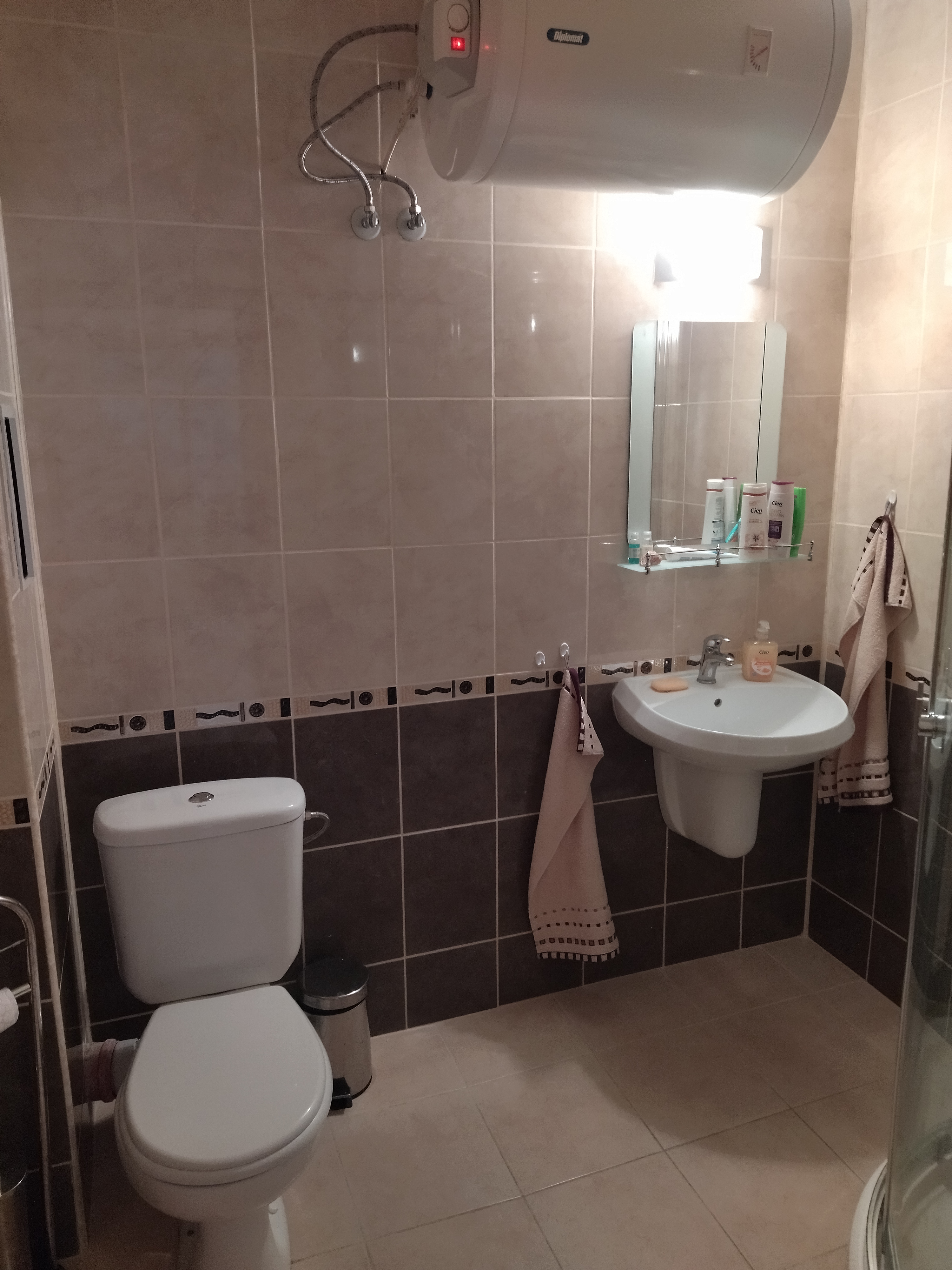 баня с душ кабина. Тъй като има достатъчно място, сме оборудвали апартамента и с две сгъваеми